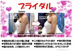 結婚式が約1ヶ月後!検索をしてHPをみて「COCONUTS」さんを知りました。ブライダルエステはしたいけど私自信が「アレルギーがあり肌が弱いので難しいかな」と思っていましたがカウンセリングの時は、初めてなので事細かに説明してくれたりアレルギーの事やお肌の事を考えて下さり施術をしていただきました!思いのほか痛みがありビックリ!!肩コリや背中がコルというのは自覚がなく、やっていただいているときに教えていただきました(笑)回数を重ねていくうちに肩の重さがなくなり軽く背中の張り感や二の腕・脇の脂肪が取れていく感覚で驚きです!!今まで上半身がこんなに軽くなるという経験はなかったのですごく嬉しいです!