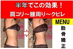 昔から背中の痛みと腰痛があり針治療に通っていたのですが「COCONUTS」さんに来始めてから1ヶ月行かなくなり肋骨矯正を受けるようになり上半身が痩せはじめてきました!痛みなどコリが慢性化していた為痛みが出ていましたが今は全くなく上半身がすごく軽くスッキリしました!これからもお願いします!
