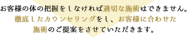 当店ではエステの施術以外にも、東洋学をベースとした体質改善を図る施術も行っており、体外(脂肪)だけでなく、体内(骨格・筋肉・筋膜)にも直接アプローチしていきます。その結果、リバウンドや元の症状へと戻りにくい身体を手に入れることができ、同時に「1回でも変化」を体感できます。