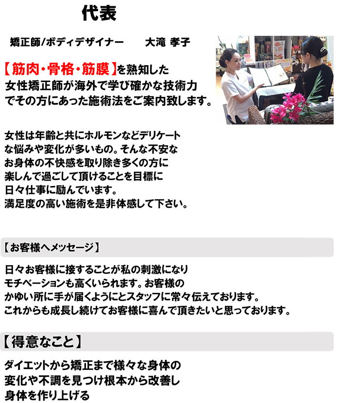 また、全国でも数少ない女性矯正師が在籍しており、親身にお客様の悩みをお伺いいたします。