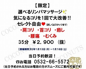 選べるリンパマッサージ 気になるコリを1回で大改善 ![]() セレクト自由 (詳しくはスタッフまで)・肩コリ・首コリ・癒し ・腰痛・むくみ 35分 ¥2,900 (抜) 【開催期間】 R2年1月13日(月)~1月18日(土) 当日予約歓迎 ![]() 0532-66-5572(当日予約の方はお手数ですが お電話にてご連絡お待ちしております) LINE予約24時間受付中 ID coconuts66-5572 (営業時間内にご返信いたします) |