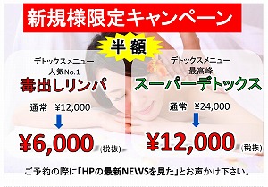今だけ 新規様のみデトックスメニューが半額で受けられる ![]() ご予約の際に「HPの最新NEWSを見た」とお伝え下さい ![]() デトックスメニュー人気No.1 毒出しリンパ 当店オリジナルの痩身美容液を使用し 全身のリンパを流していきます。 その後じっくりお身体を温めデトックス ![]() ![]() デトックスメニュー最高峰 スーパーデトックス 当店デトックスメニューの中で一番贅沢な内容 ![]() 全身のリンパを足先から首までくまなく流し ダイエット、美肌、殺菌効果のあるブラックハーブを用いて たっぷりデトックスしていきます ![]() 期限:3月30日(土)迄 是非、このお得な機会に受けられてみて下さい ![]() ![]() |