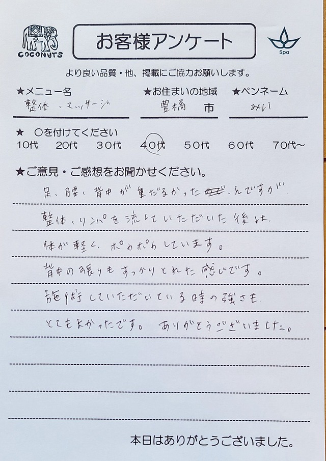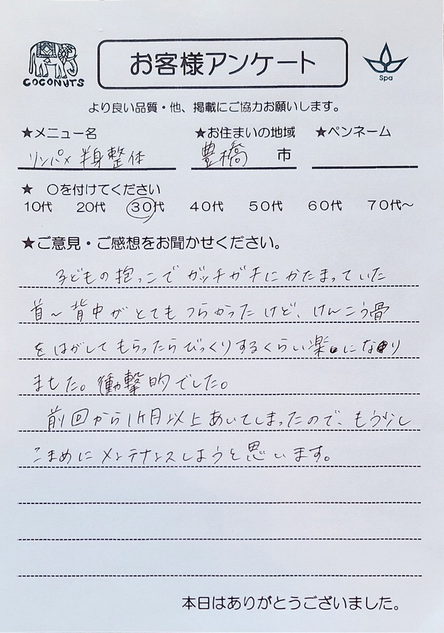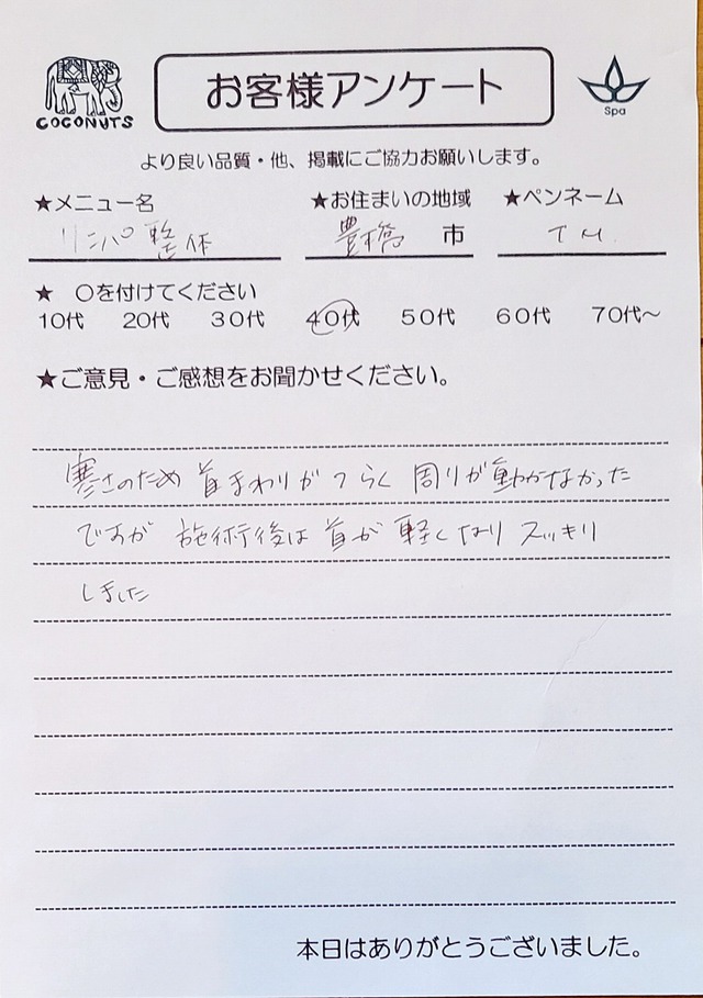 豊橋市 T.Mさん 40代【リンパ×整体】R2.12.18