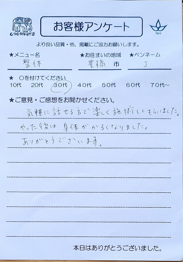 施術していただいてる時の強さもとてもよかったです。ありがとうございました。