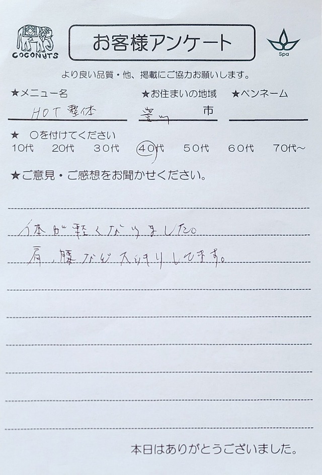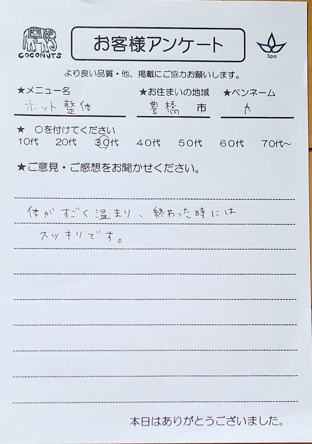 豊川市 匿名さん 40代【HOT整体】R3.1.11