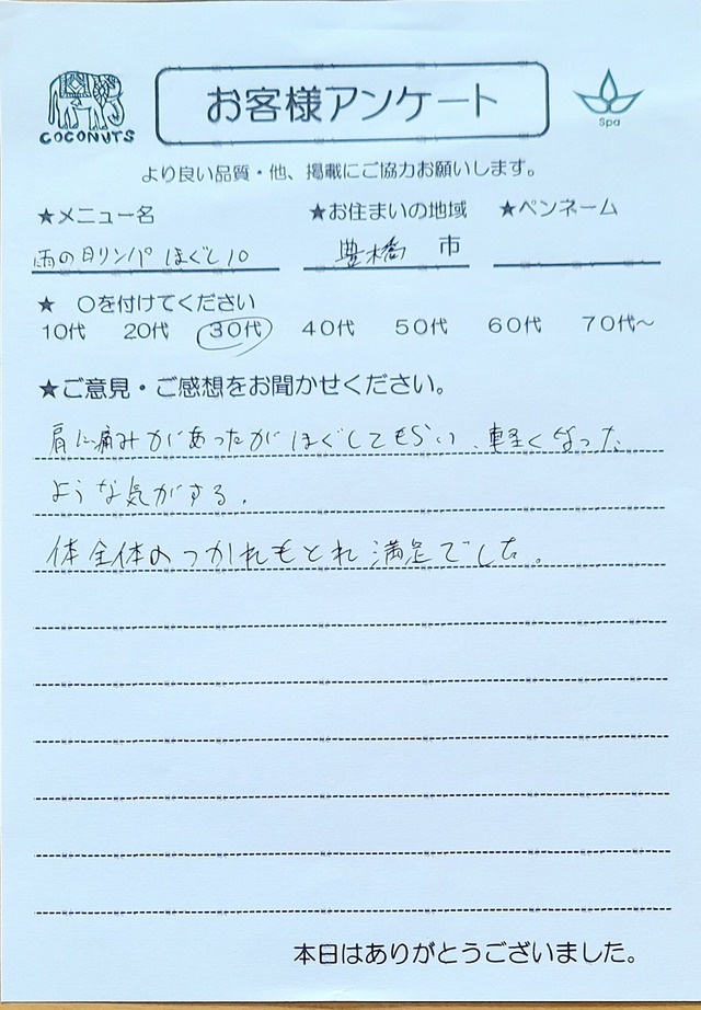 豊橋市 匿名さん 50代【肩ほぐし+ほぐし10】R2.9.14