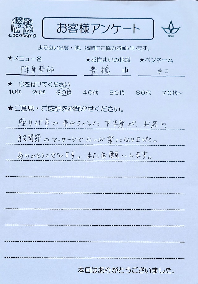 豊橋市 匿名さん 30代【快眠マッサージ】R2.9.22