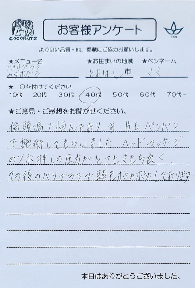豊橋市 匿名さん 40代【快眠マッサージ】R2.9.18