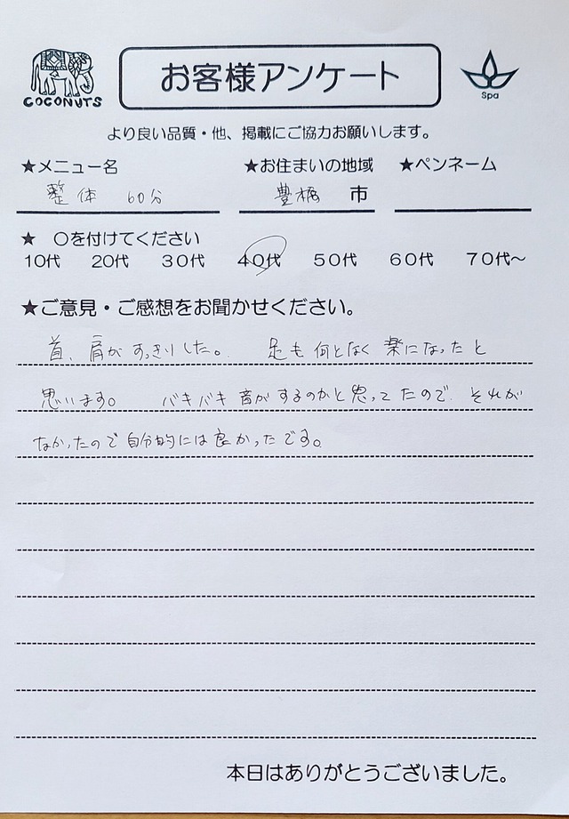 豊橋市 匿名さん 40代【整体 60分】R2.11.4