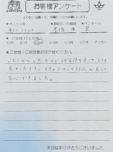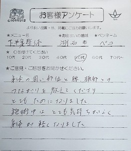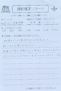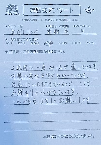 今まで経験の無い施術でおどろきがありましたが、痛みがなくなり体調がどんどん良くなるのがとても良かったです。