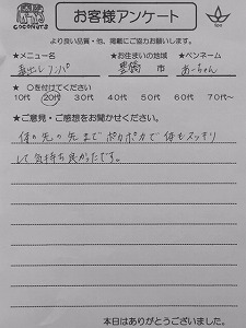 体の先の先までポカポカで体もスッキリして気持ち良かったです。