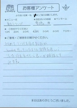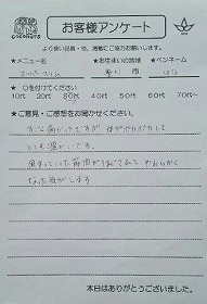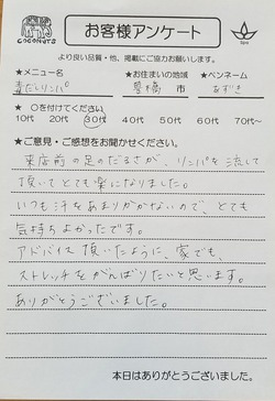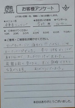 来店前の足のだるさが、リンパを流して頂いてとても楽になりました。