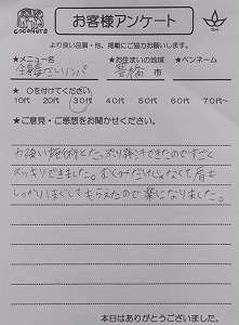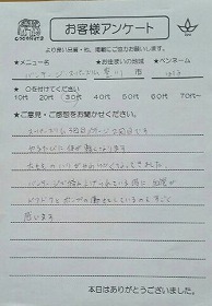 施術後、とっても体が軽くなり肩の重みがスッキリしました。