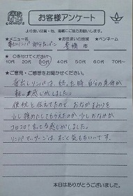 初めてのリンパマッサージでした。全身がとても軽くなり気持ち良かったです。