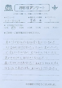 施術後、血行が良くなりつま先がポカポカし気持ちがよくなりました。