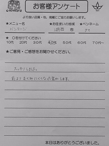 痛みもありましたが・・・施術後のスッキリ感がなんとも言えないです!!ありがとうございました。