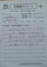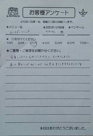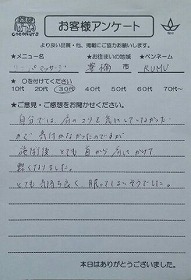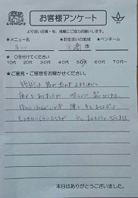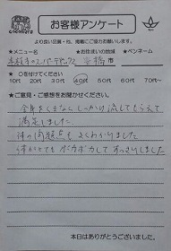 施術をして頂いた時生理痛がひどく腰も痛かったが、施術後たった時に痛みがなく重だるさもなくなり体が軽くスッキリしました。