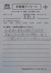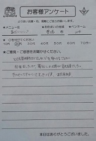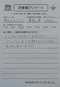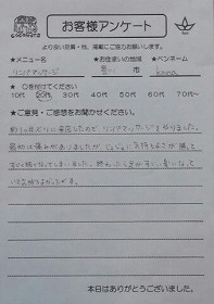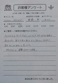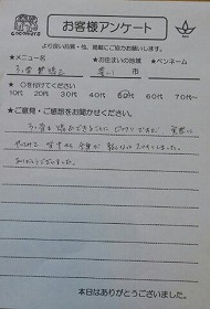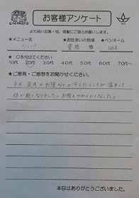 施術後も、身体の内側よりポカポカ温まっているのを、感じると同時に凝っていた箇所がスッキリとした感じになりました。