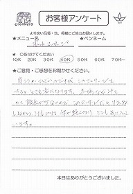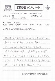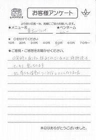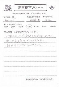 体調が悪く困っていましたが施術を受けるようになりみるみる改善されました。 腰と膝の痛みは消え、肩凝りもしなくなりました。 固まっていたセルライトも徐々に柔らかくなり、体重の減少以上見た目がすっきりしました。 服のサイズも2サイズダウンしました。 何より、体のだるさがなくなり、元のように元気に動ける様になり気持ちも明るくなりました。 とても感謝しています。