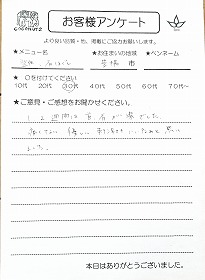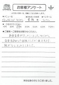 全身ポカポカ温まって、呼吸もしやすくなりました。重かった肩や背中もスッキリして、軽くなりました。全身ガチガチになる前にまたお願いしたいです。
